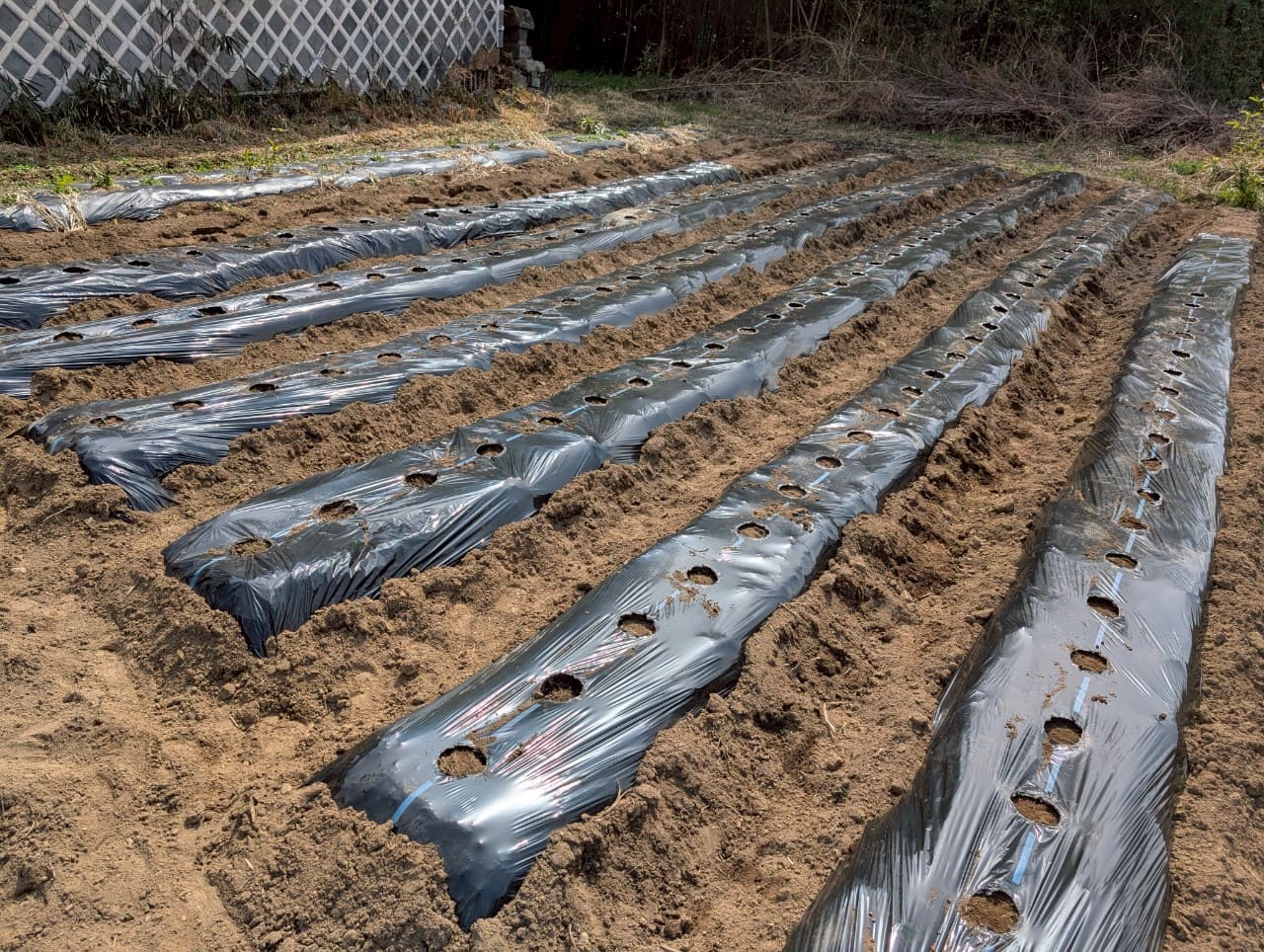 3月、米ぬかと自然由来の微生物資材と有機肥料をまき、畑の定植準備をしました。